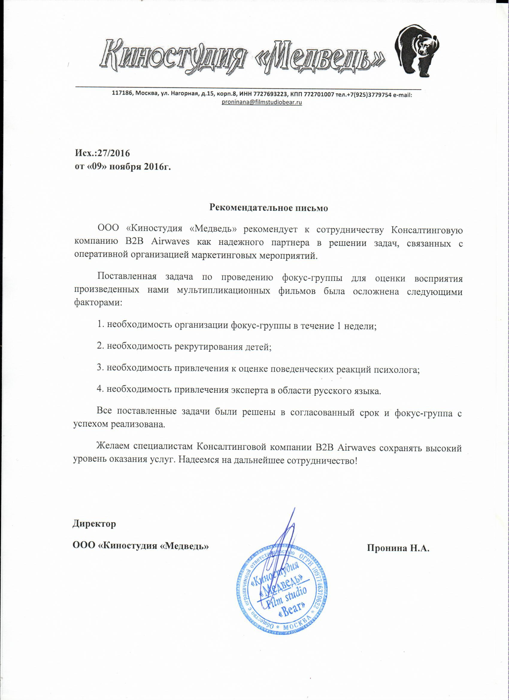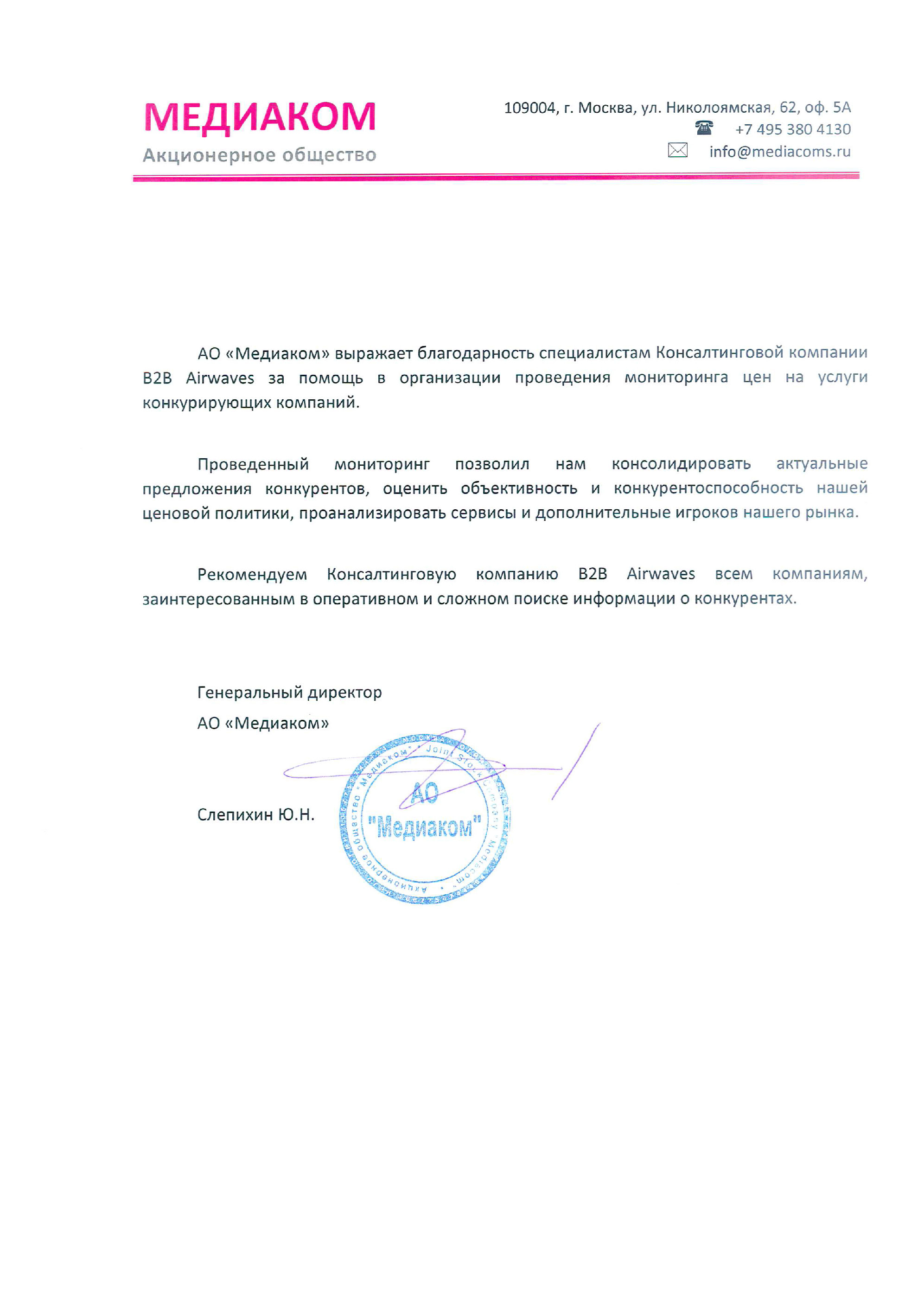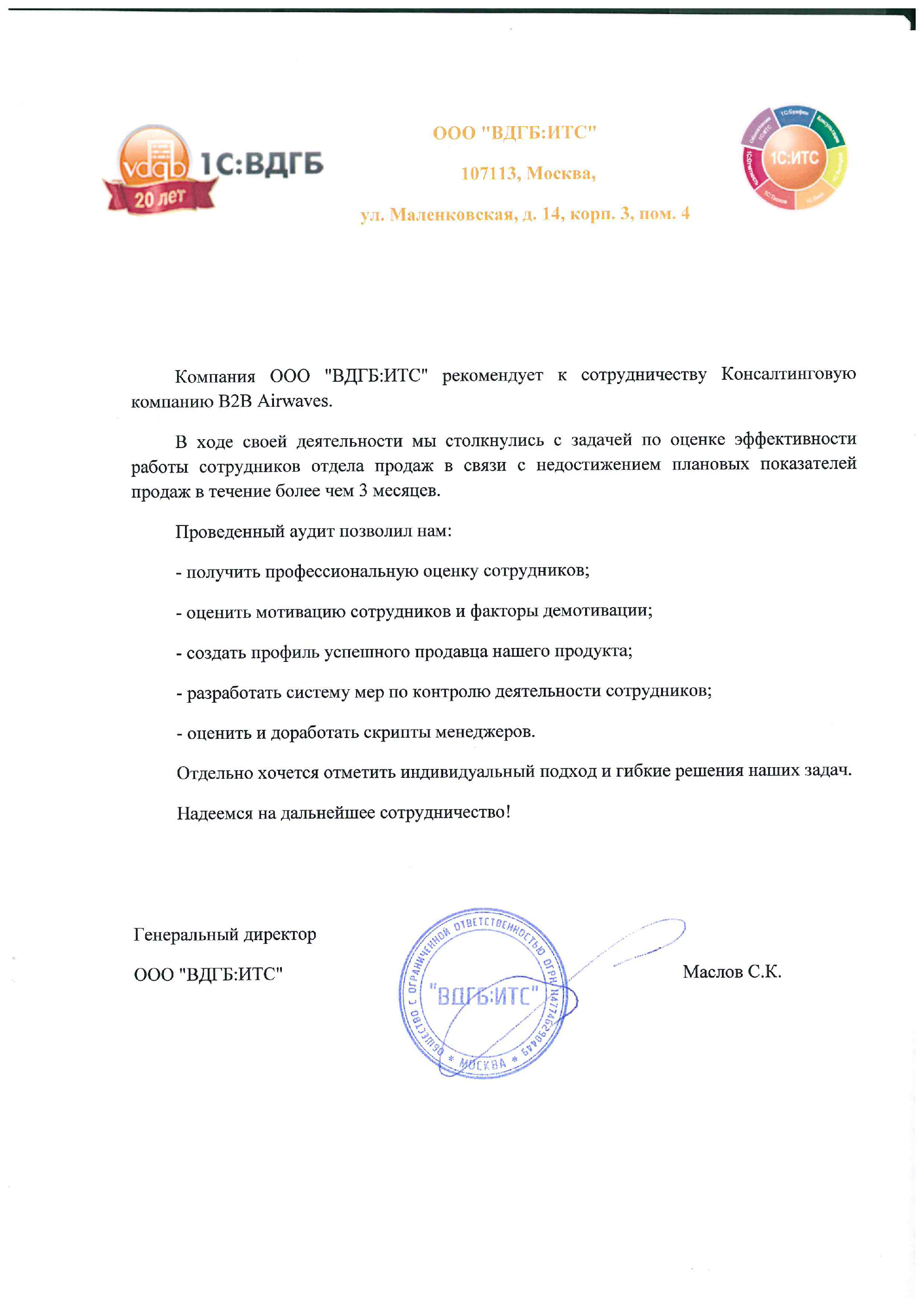 Наша компания рада была сотрудничать со специалистами Консалтинговой компании B2B Airwaves и желает ей успехов в ее профессиональной деятельности.