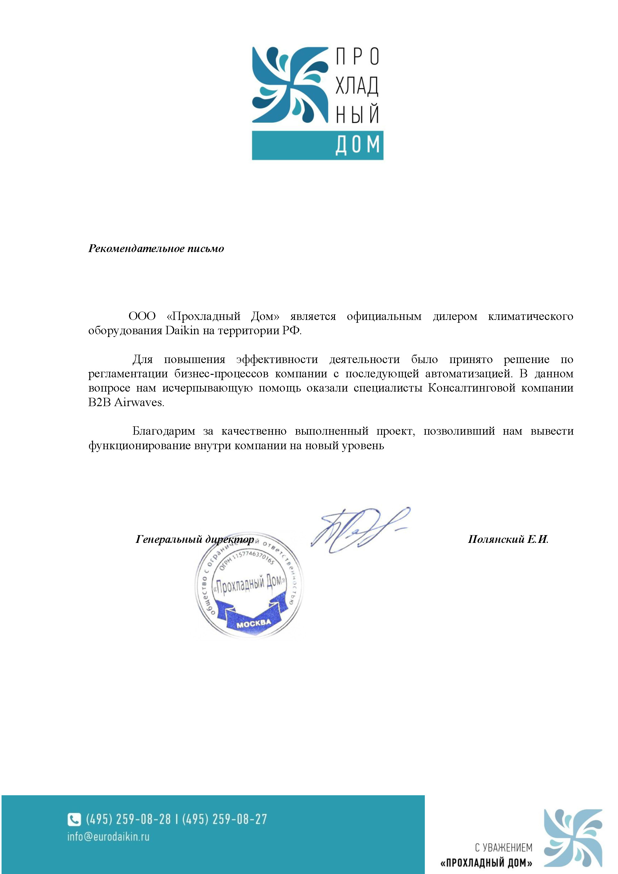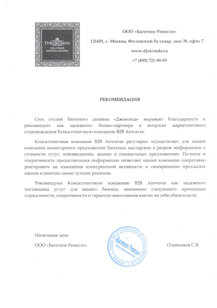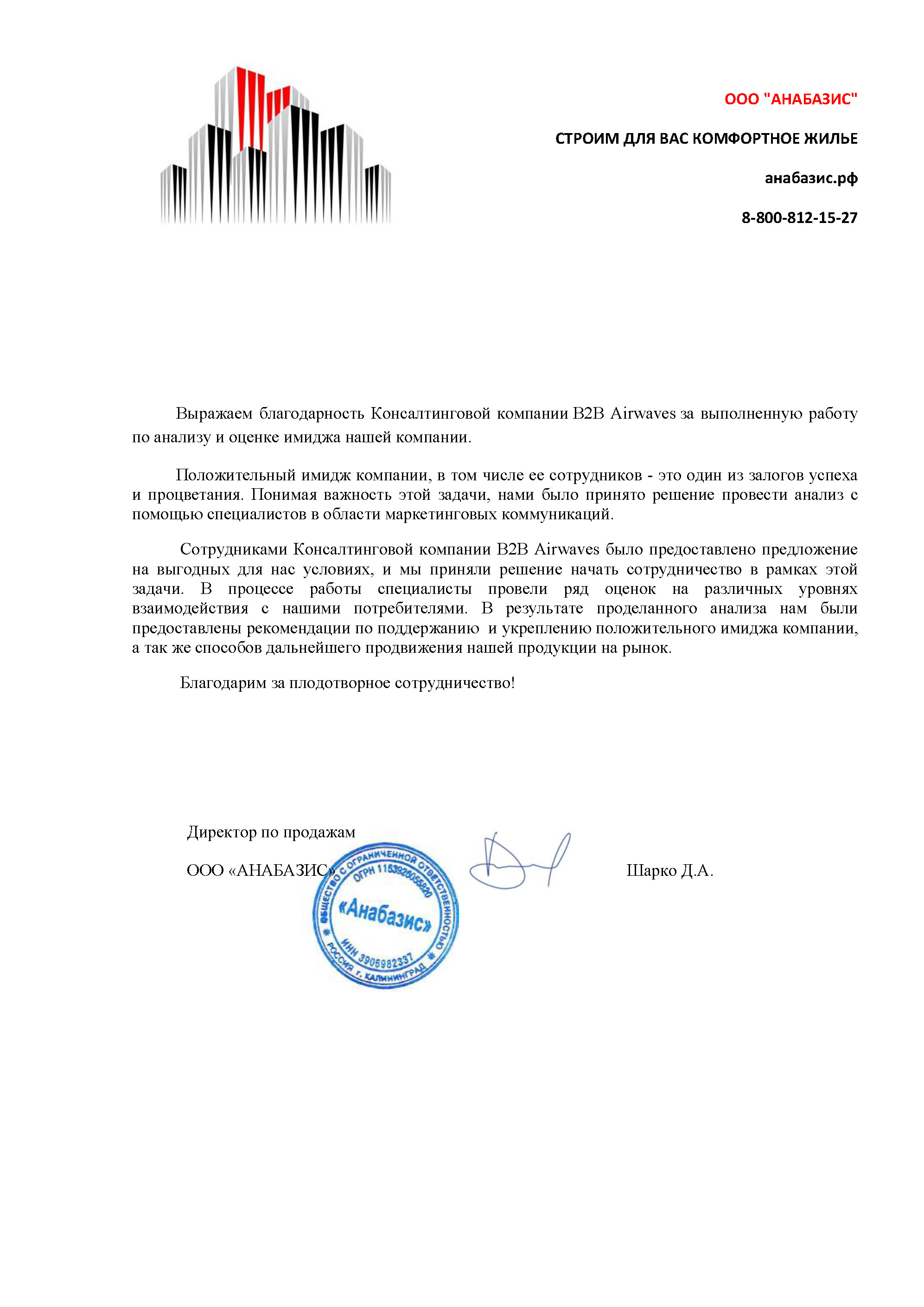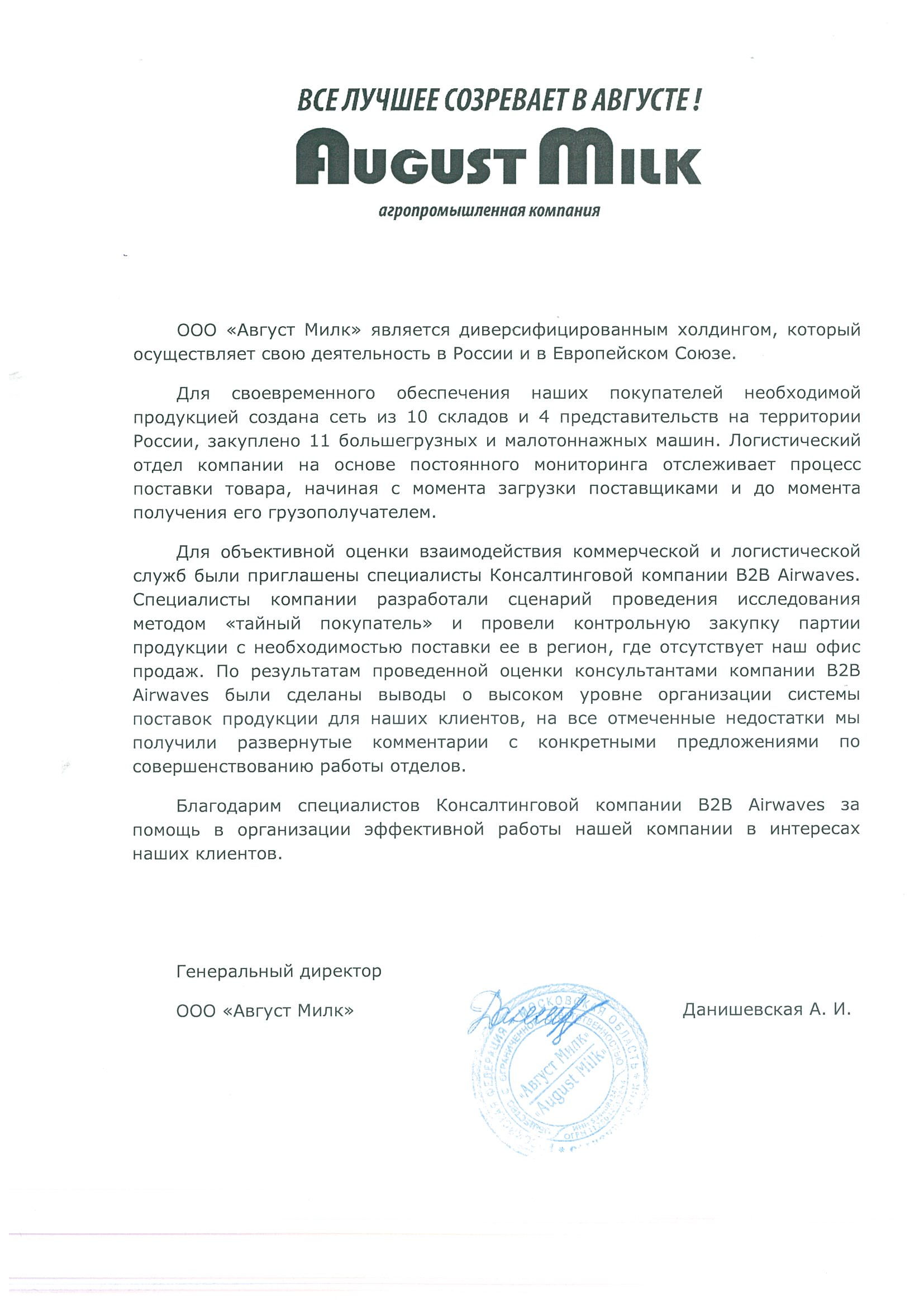 Выражаем благодарность за проделанную работу и рекомендуем к сотрудничеству экспертов Консалтинговой компании B2B Airwaves для повышения эффективности работы вашего бизнеса.