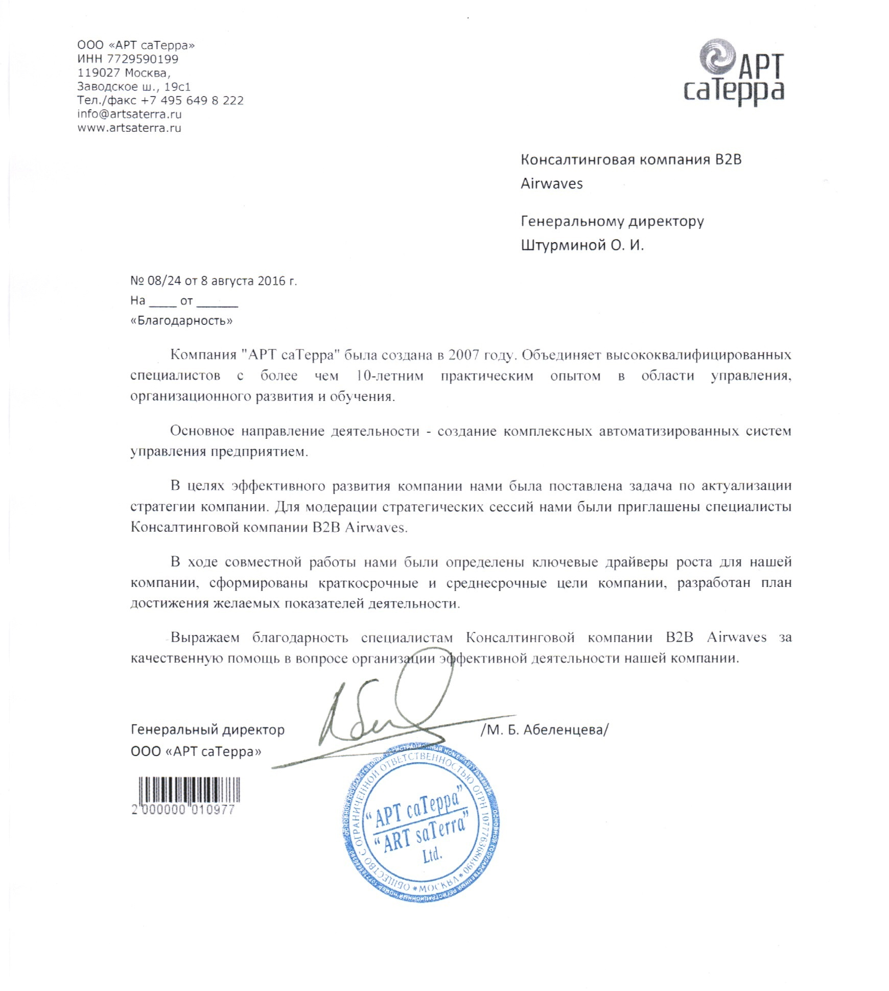 Выражаем благодарность специалистам Консалтинговой компании B2B Airwaves за качественную помощь в вопросе организации эффективной деятельности нашей компании.