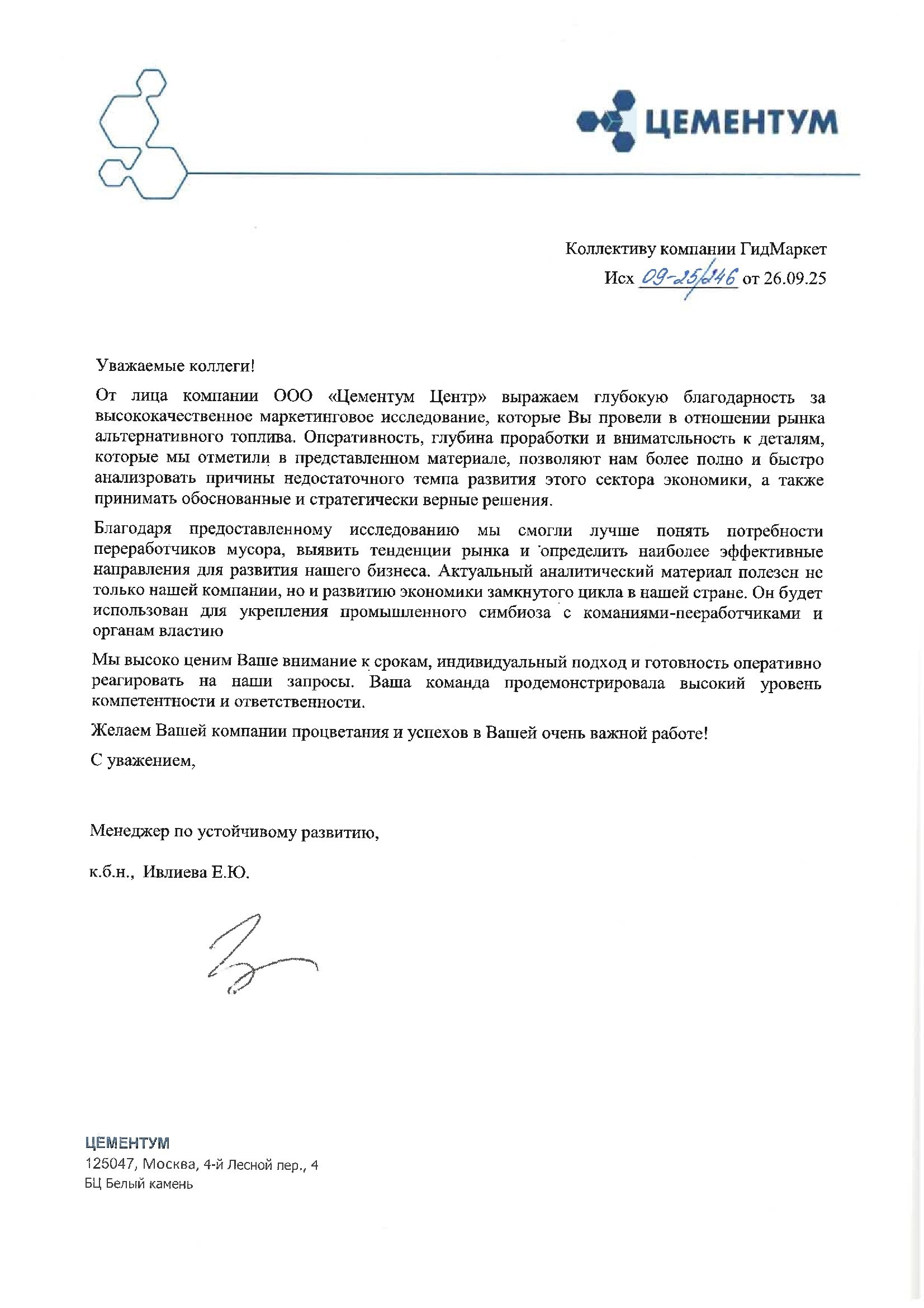 От лица компании ООО «Цементум Центр» выражаем глубокую благодарность за высококачественное маркетинговое исследование, которые Вы провели в отношении рынка альтернативного топлива. Оперативность, глубина проработки и внимательность к деталям, которые мы отметили в представленном материале, позволяют нам более полно и быстро анализровать причины недостаточного темпа развития этого сектора экономики, а также принимать обоснованные и стратегически верные решения.