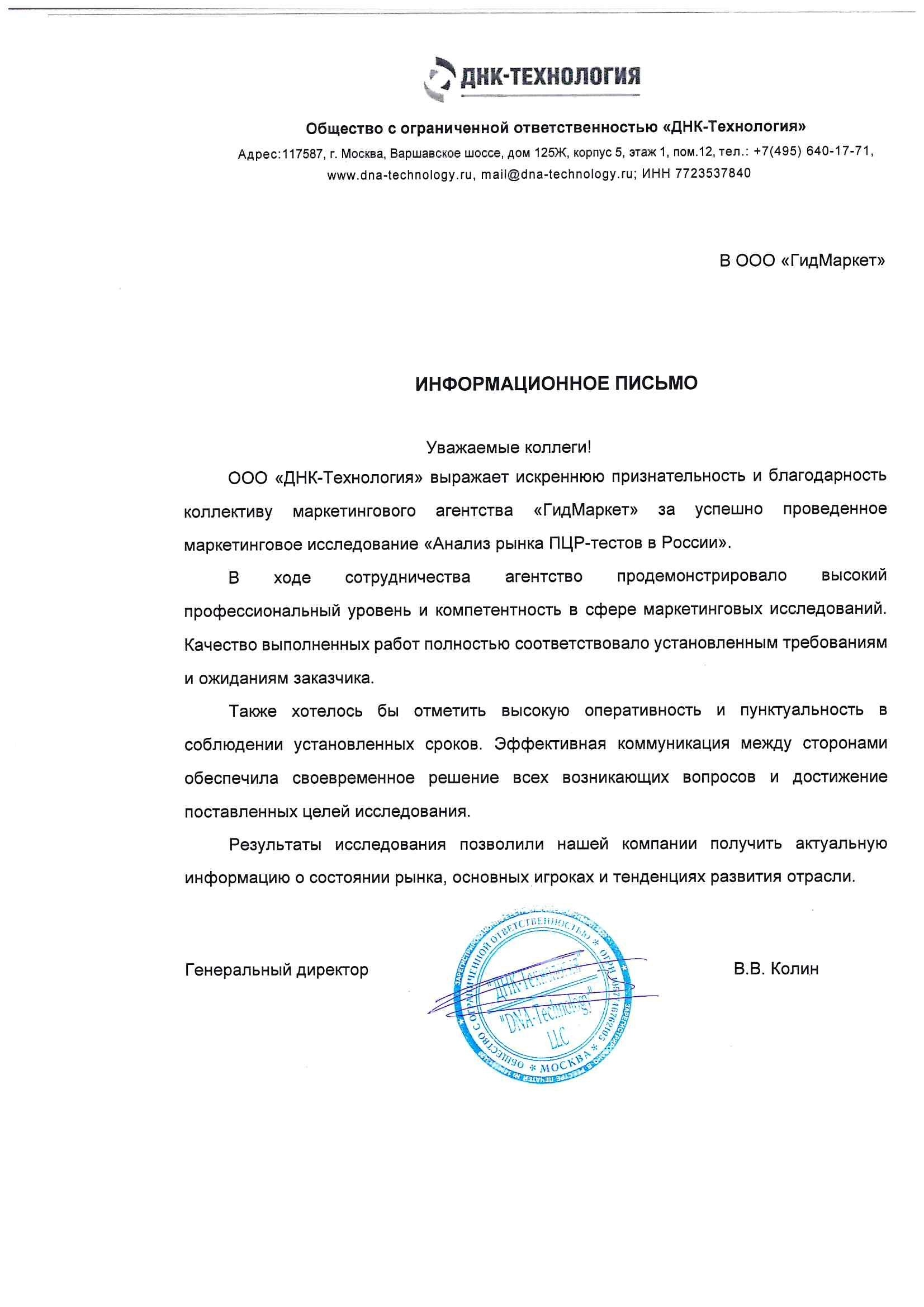 ООО «ДНК-Технология» выражает искреннюю признательность и благодарность коллективу маркетингового агентства «ГидМаркет» за успешно проведенное маркетинговое исследование «Анализ рынка ПЦР-тестов в России».