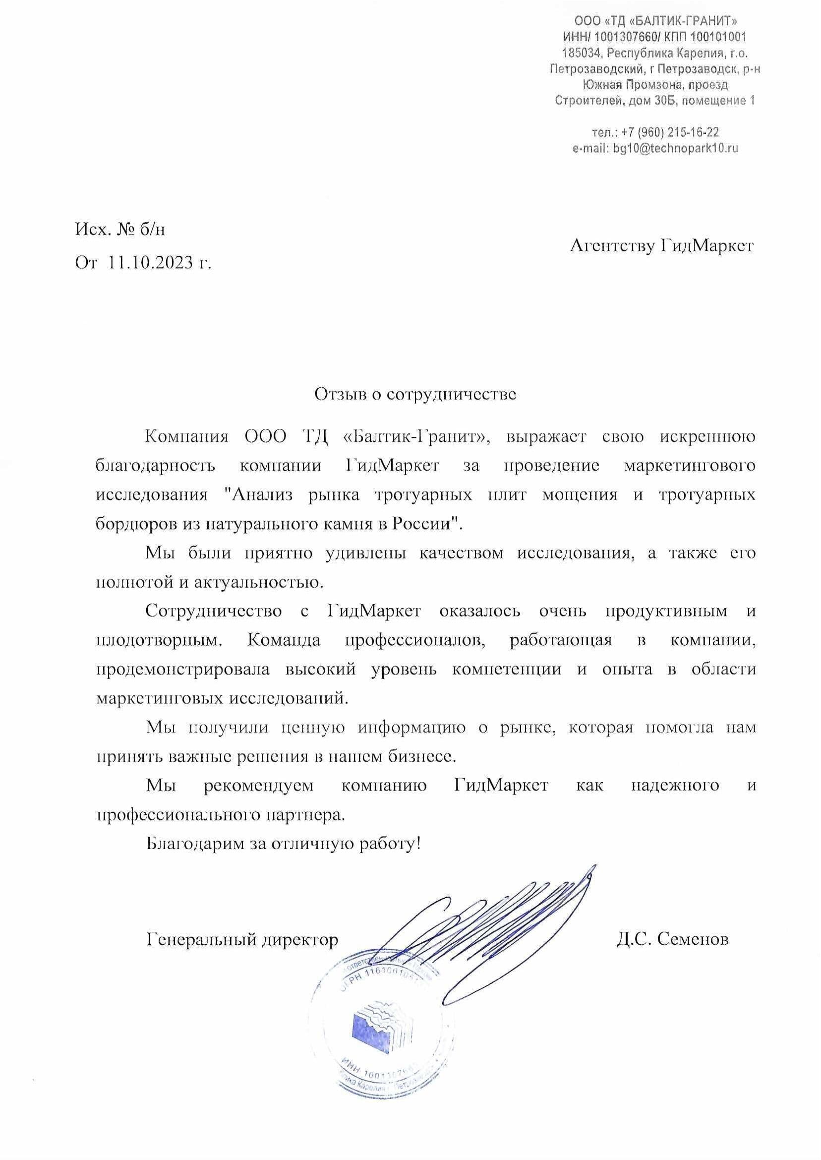 Поученная в отчёте информация нас полностью устроила. Исследование было предоставлено точно в утверждённый договором срок. Результатом сотрудничества мы полностью довольны. Выражаем агентству «ГидМаркет» благодарность за качественно выполненную работу.