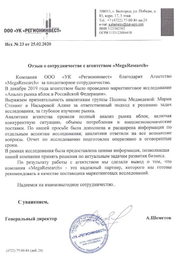 Рекомендуем агентство «MegaResearch» как надежного партнера и надеемся на дальнейшее взаимовыгодное сотрудничество.
