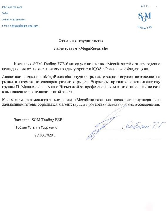 Мы готовы рекомендовать агентство «MegaResearch» как надежного партнера и надеемся на дальнейшее взаимовыгодное сотрудничество.